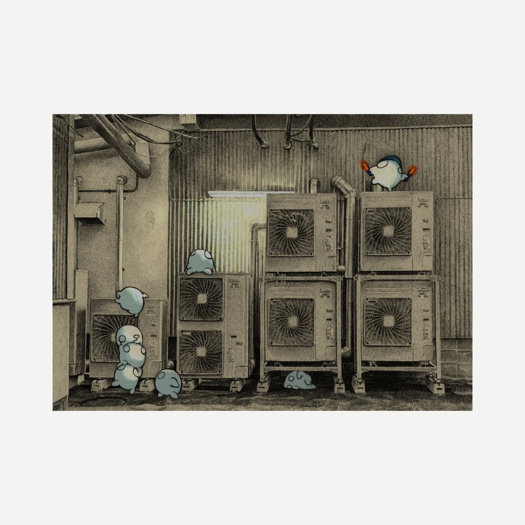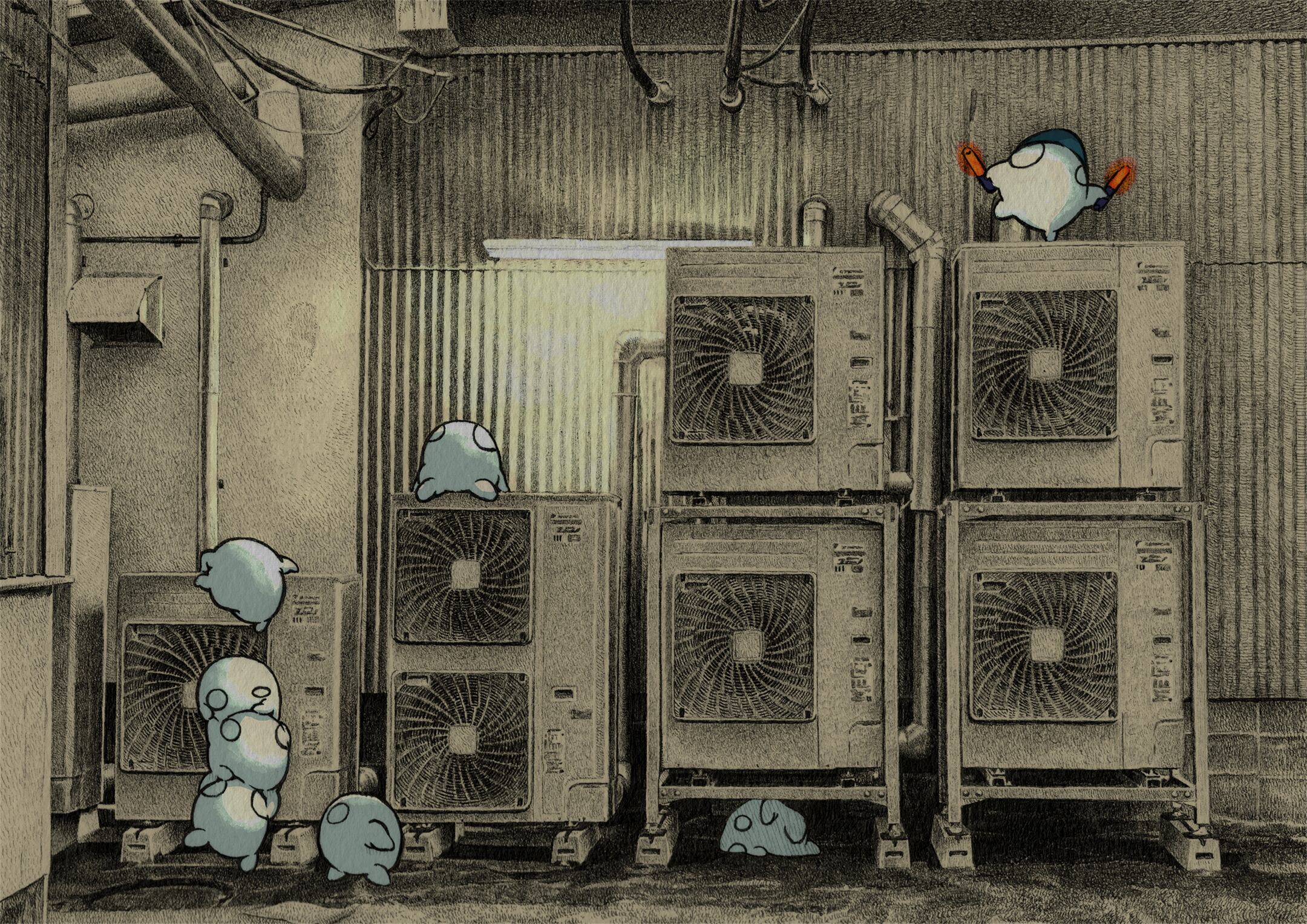 『日常に潜む非日常』をテーマに、0.03mmで緻密に描かれた背景と漫画的キャラクターの組み合わせによって、独自の世界を創出している。背景とキャラクターの間に漂う違和感が、作品の魅力となっている。