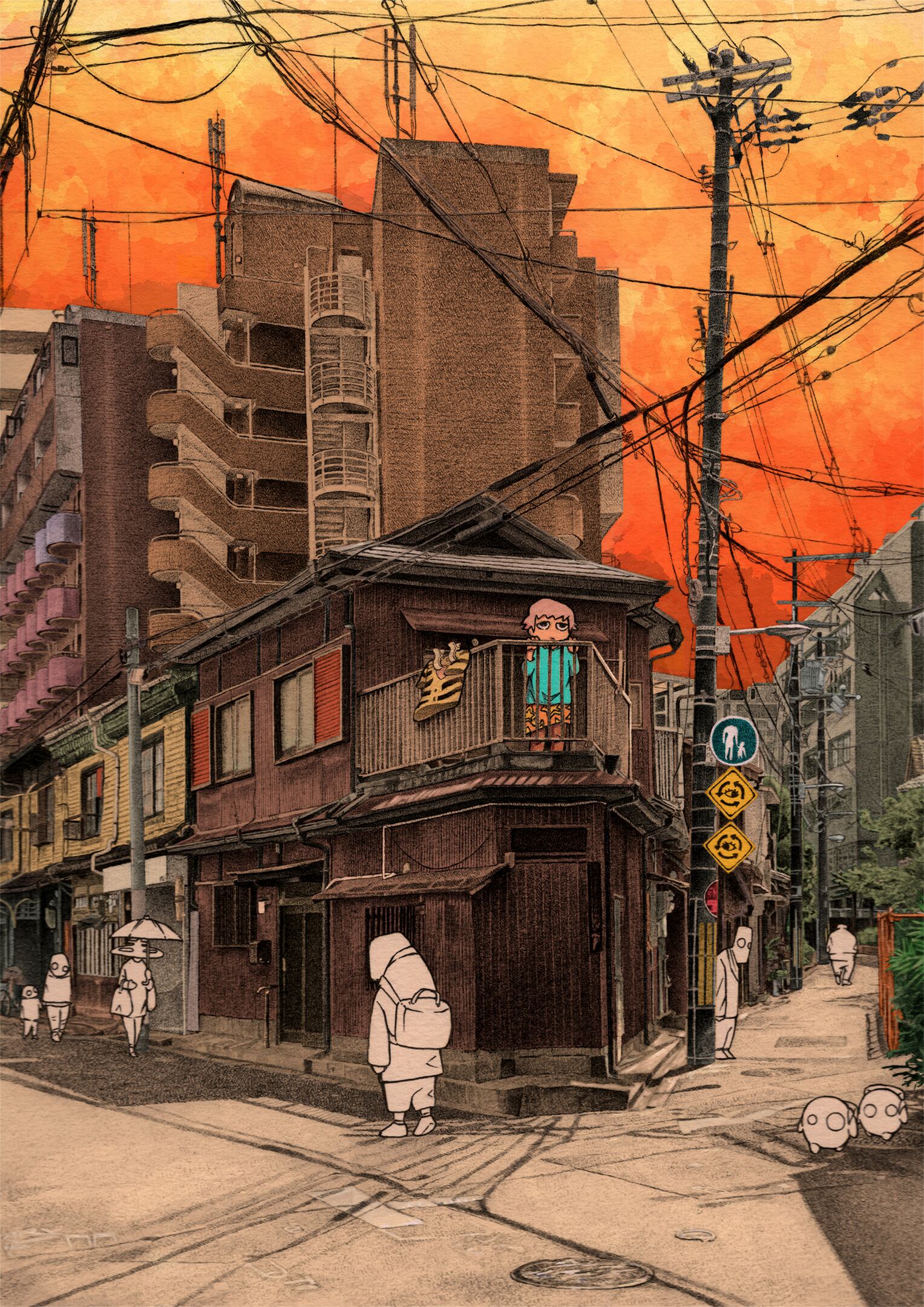 『日常に潜む非日常』をテーマに、0.03mmで緻密に描かれた背景と漫画的キャラクターの組み合わせによって、独自の世界を創出している。背景とキャラクターの間に漂う違和感が、作品の魅力となっている。