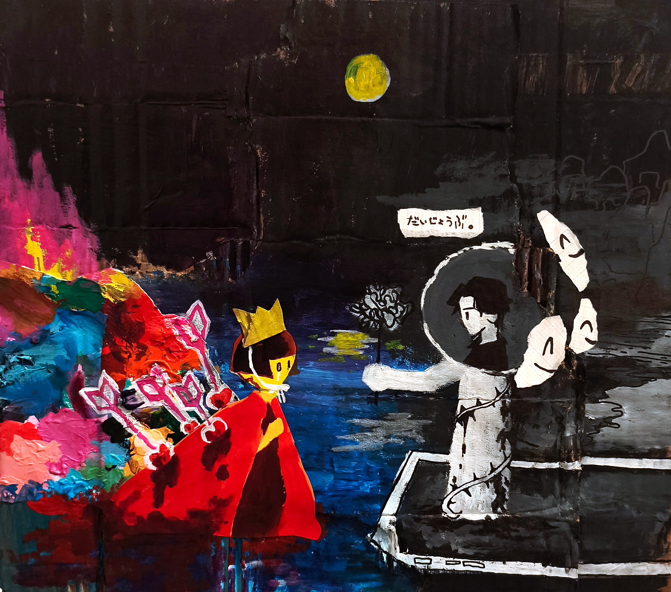 アクリル絵の具、クレヨン、紙、筆ペン、フェルトペン、ボールペン、段ボール、木製パネル