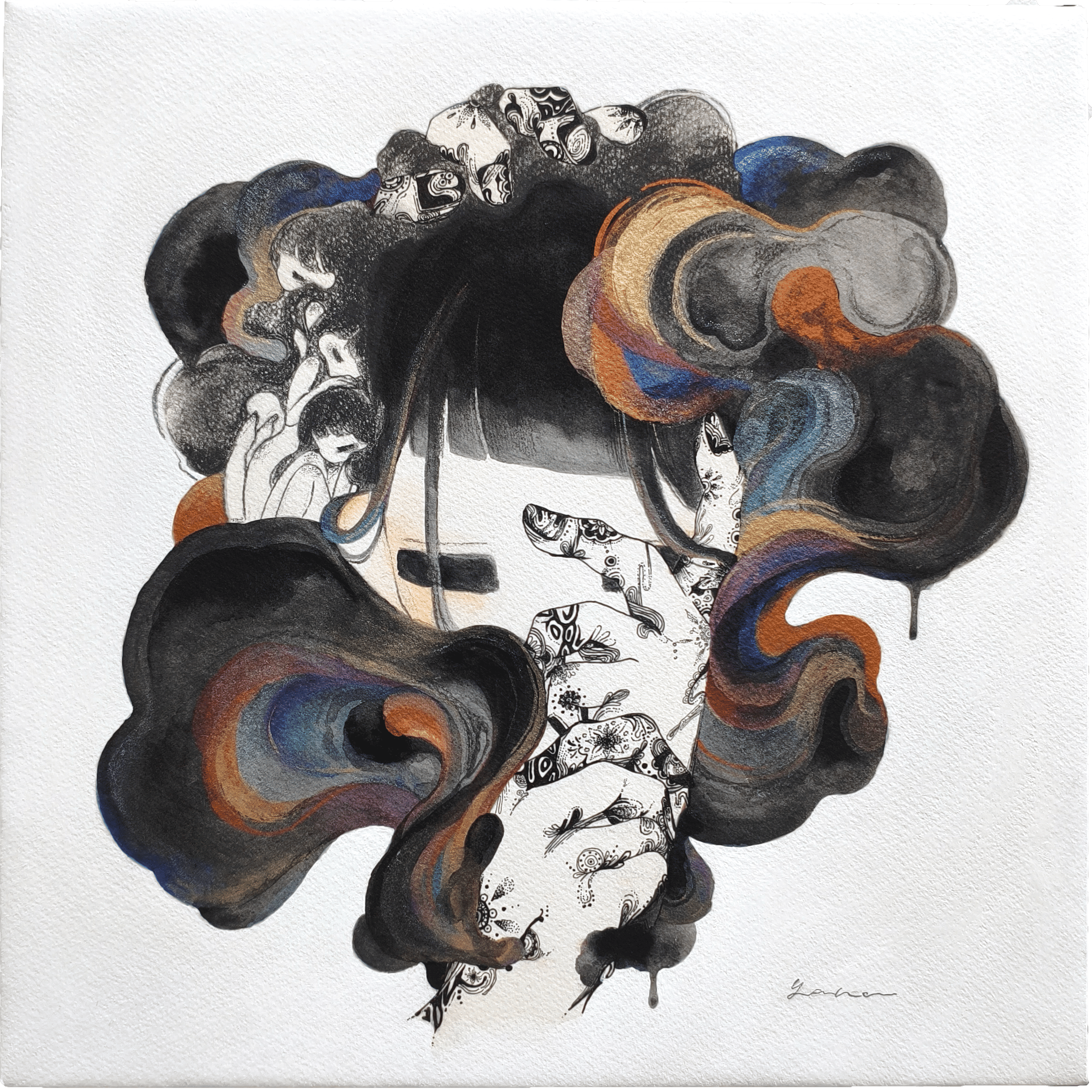 Wooden panel, Paper, Watercolor paint,Pencil, Ballpoint pen, Acrylic paint